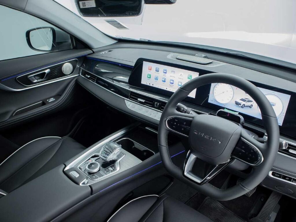 LED headlights & taillights, alloy wheels, and a roof spoiler inject a contemporary appearance. The power mirrors are integrated with an auto-dimming function, adding more pomp and allure. The Cherry emblem is present at the front and rear stamping its authority wherever it traverses.