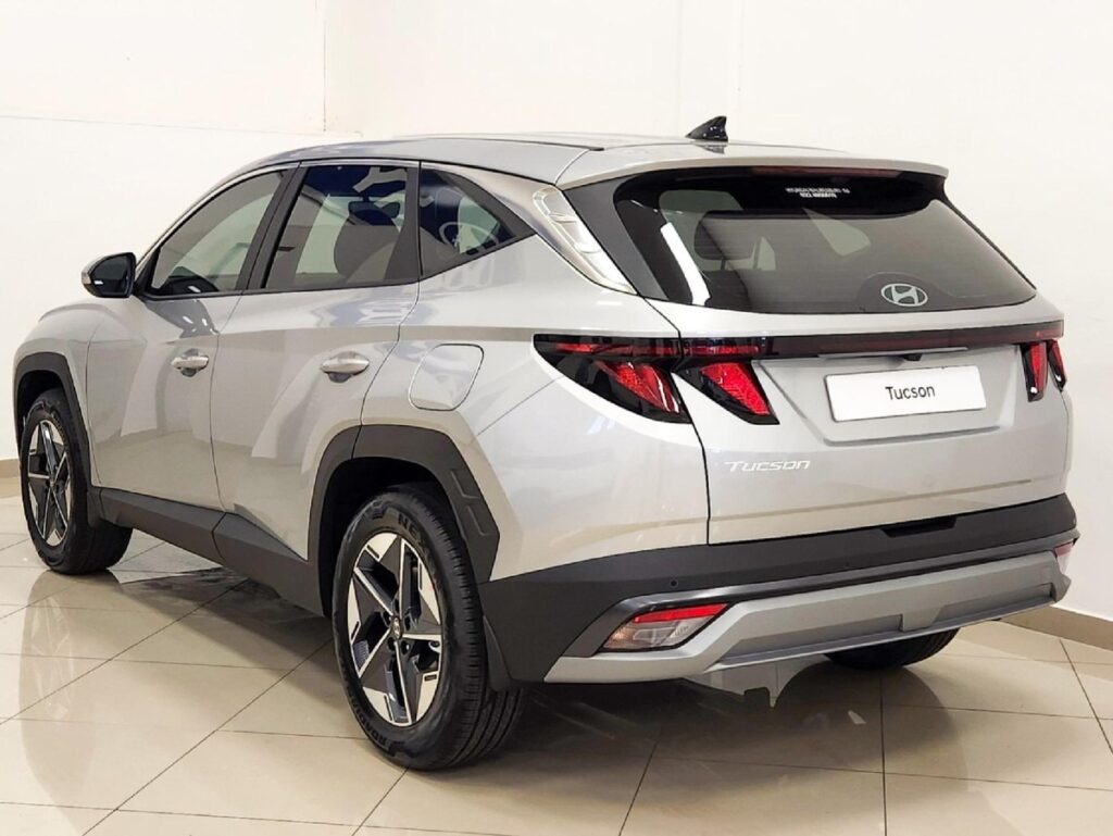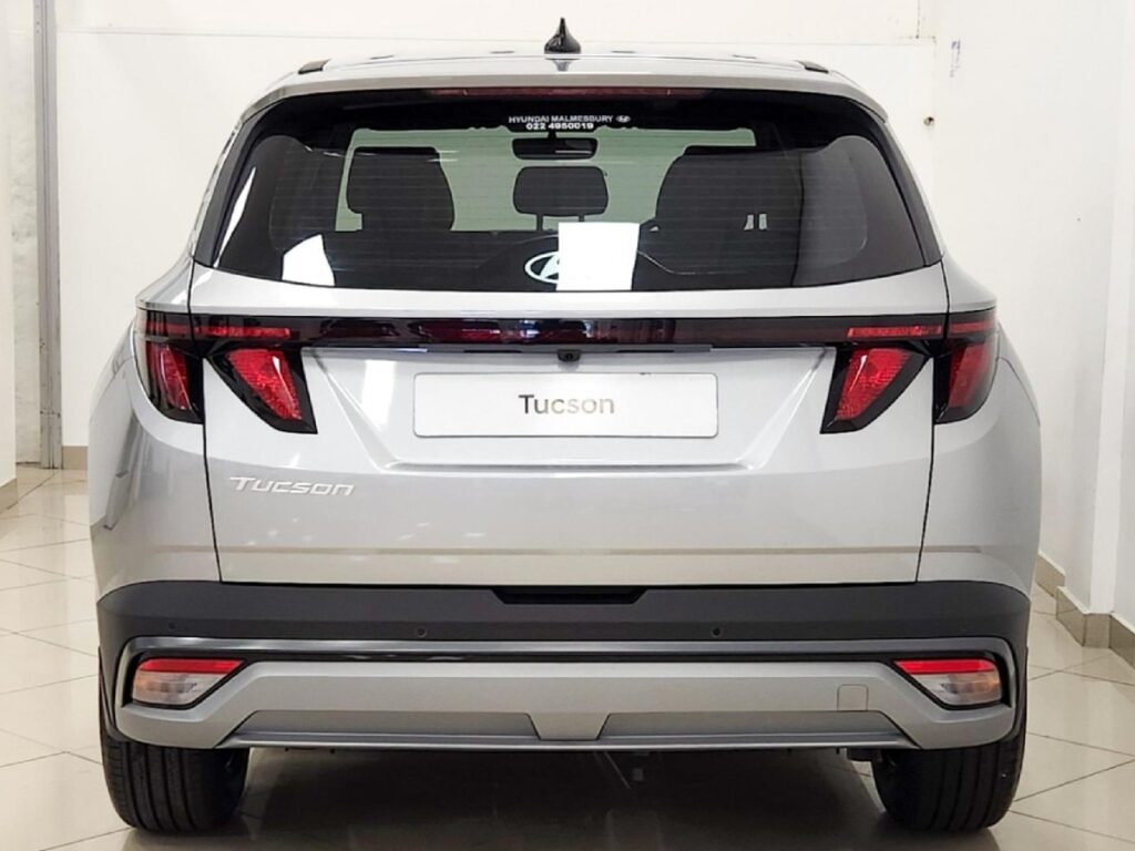 The rear features a power liftgate and a roof spoiler. The Hyundai emblem asserts its presence wherever it traverses. The Tucson is available in a spectrum of colors.